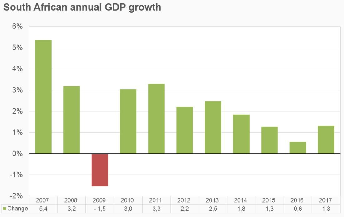 HDP Jihoafrické republiky v roce 2017 vzrostlo o 1,3 %, což není příliš oslňující výsledek, ale je to o 0,3 % nad očekávaným výsledkem. Důvodů vyššího tempa růstu HDP bylo více, ale ten hlavní je opravdu dobrý hospodářský rok zemědělců, dále růst výnosů v hornictví a obchodu. Odhady růstu HDP na rok 2018 se pohybují kolem 1,4 až 1,9 %.
