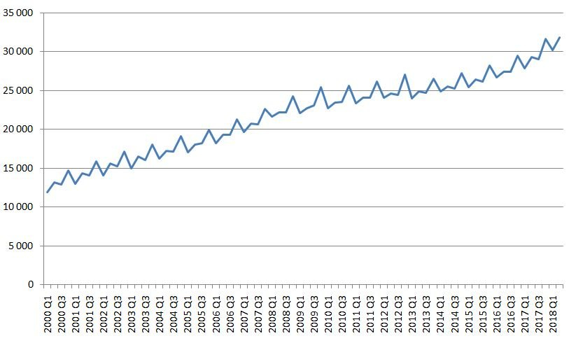 Vývoj průměrné mzdy mezi roky 2000 až po druhý kvartál 2018