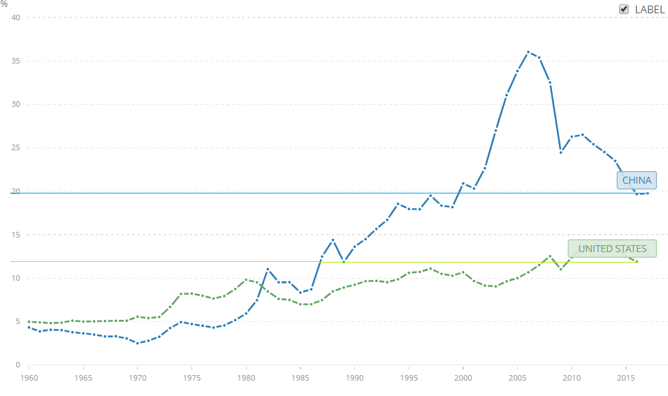 Graf: Podíl exportů na HDP v Číně a USA (Zdroj: Worldbank)