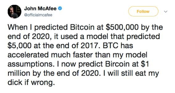McAfee je tak trošku blázen. V roce 2017 využíval svého vlivu na Twitteru, aby pumpoval některé kryptoměny, a za to byl jejími zástupci bohatě odměněn, což na jeho důvěryhodnosti nepřidává. Nicméně spousta vlivných lidí předpovídá cenu bitcoinu v řádech statisíců dolarů.