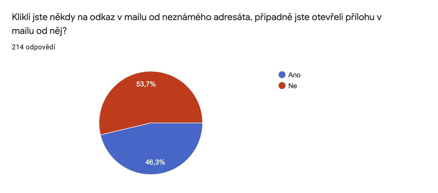 Necelá třetina respondentů třeba přiznala, že největším problémem pro ně je, že by mohli kliknout na odkaz v e-mailu od neznámého adresáta. A přes 46 procent lidí přiznalo, že se jim to již stalo, případně dokonce otevřeli přílohu, který takový e-mail obsahoval.