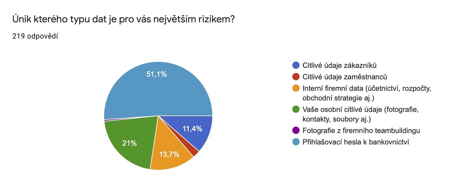 Naopak méně překvapivý byl výsledek, čeho se lidé v případě kyberútoku na ně nejvíce bojí. Přes 51 procent respondentů uvedlo, že by je nejvíc zasáhla ztráta přihlašovacích údajů k bankovnictví. “Je škoda, že respondenti nevěnují stejnou 'péči' interním firemním datům nebo citlivým údajům o zaměstnancích. Přitom právě zde mohou vzniknout nedozírné ztráty, finanční ale i v reputaci jejich firmy,” dodal Kašpar.