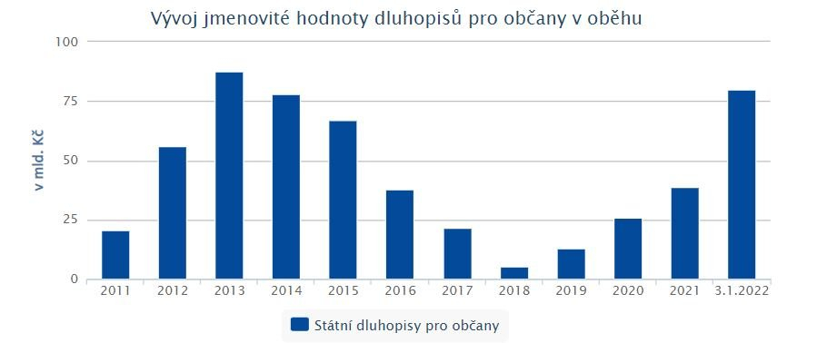 Rekordní zájem občanů o státní dluhopisy zapříčinil zvýšení stavu jmenovité hodnoty dluhopisů v oběhu na 80,1 miliard korun. Jmenovitá hodnota dluhopisů k začátku roku 2022 dosáhla na 2. místo od doby, co se dluhopisy začaly poskytovat občanům, tedy od roku 2011, kdy se vyšplhala k hranici 87,6 miliard korun.