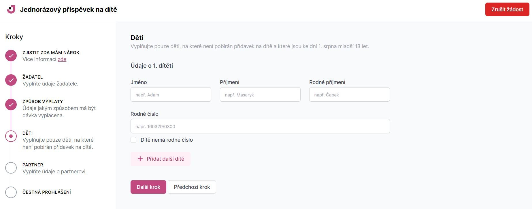 Dále budete vyplňovat údaje o dítěti, případně dětech, jestliže žádáte za více dětí (jméno, rodné číslo).