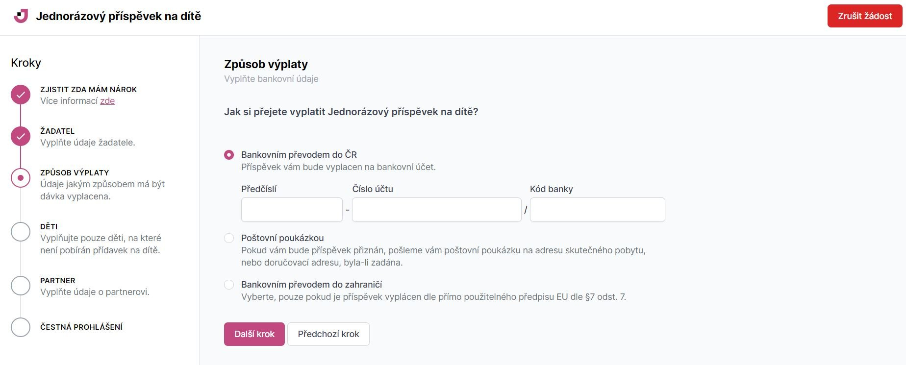 Na další straně vyplníte, jakým způsobem chcete příspěvek obdržet. Máte na výběr platbu na účet či složenkou. Pokud chcete dostat platbu na účet, vyplňte číslo účtu.