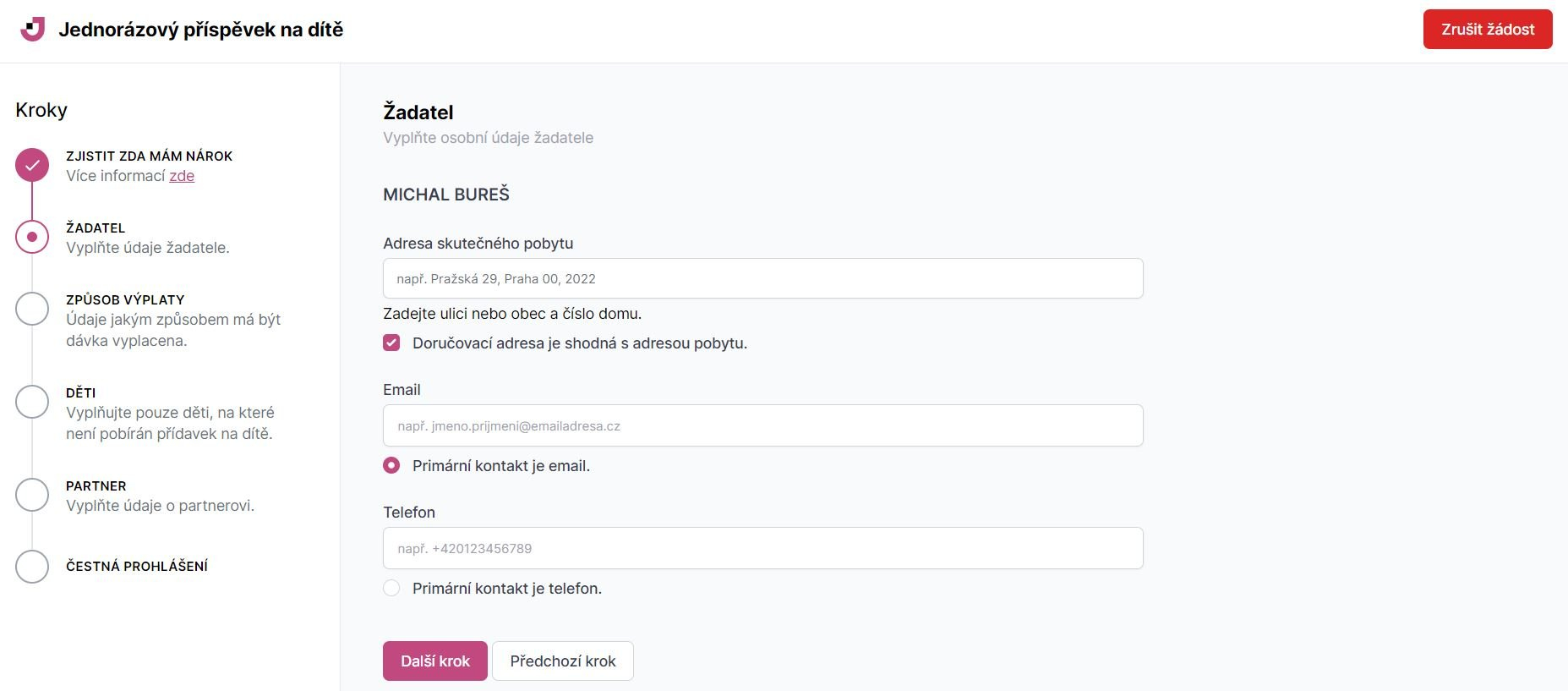 Nejdříve zakliknete „Začít se žádostí“, kde vyplníte adresu svého skutečného pobytu (nemusí být trvalé bydliště), e-mail a telefon.