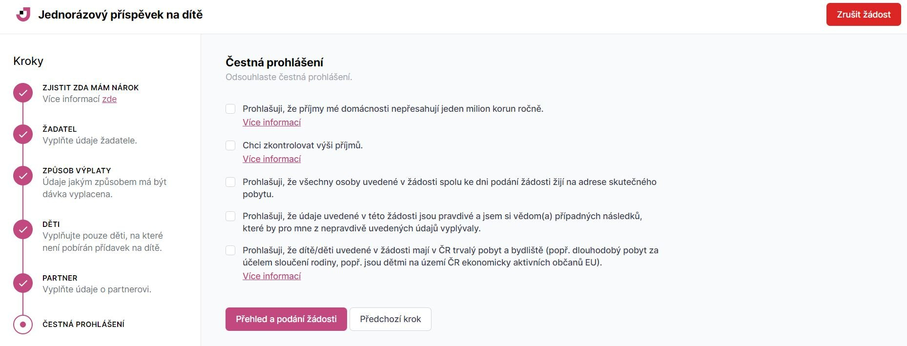 Na poslední straně na vás čekají čestná prohlášení o příjmech, o vyplněných pravdivých údajích a to, že žijete na adrese skutečného pobytu.