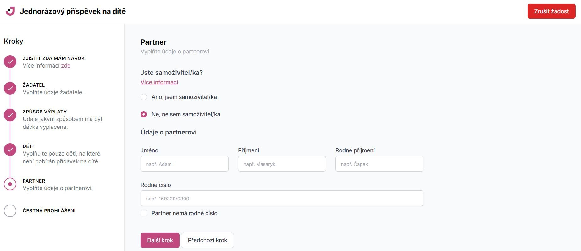 Po identifikaci dítěte přišla řada na identifikaci partnera (jméno, rodné číslo). Jestliže jste samoživitel/ka, tento krok přeskočte a zaškrtněte, že jste samoživitel/ka.