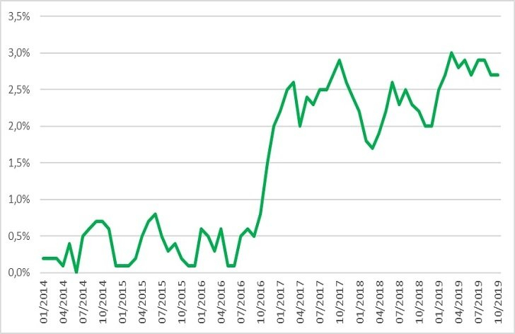 Banky si tedy mohou mnout ruce, zato my drobní střadatelé máme důvodů k radosti jen pramálo. V době, kdy meziroční míra inflace (vyjádřená přírůstkem indexu spotřebitelských cen) dosahuje 2,7 %, to znamená, že nám „spící“ peníze na běžných účtech citelně prodělávají – z každých 100 tisíc korun ležících na běžném účtu nás inflace za poslední rok připravila o 2.700 Kč. Řada z nás si tuto skutečnost možná ani neuvědomuje. Vývoj míry inflace vyjádřené přírůstkem indexu spotřebitelských cen ke stejnému měsíci předchozího roku od roku 2014 je znázorněn v následujícím grafu.