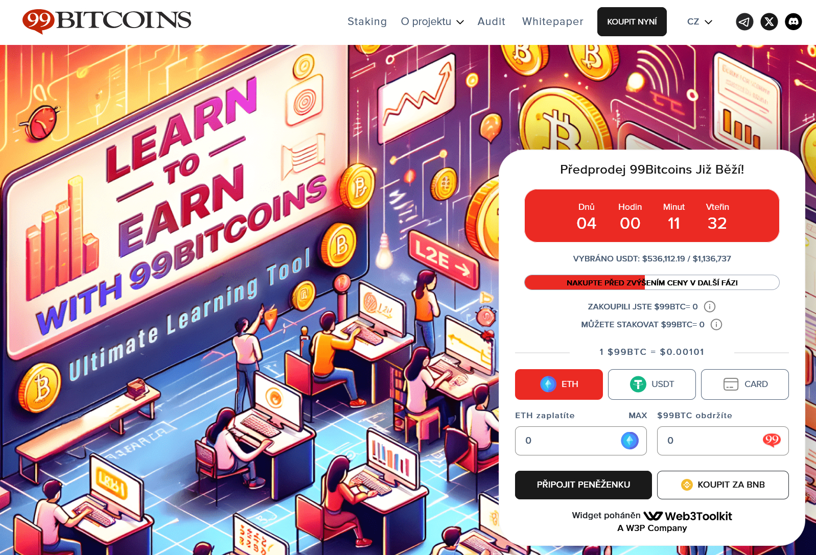 Co se týče stakingu zmíněného výše, ten aktuálně vzhledem k nedávnému spuštění projektu dosahuje odměn ve výši až 3 715 % v podobě extra tokenů $99BTC. Postupem času společně s přílivem nového kapitálu se však odměny budou snižovat, takže v případě, že byste chtěli co možná nejvyšší zhodnocení, je vhodné nechat tokeny stakovat od prvního momentu od nákupu.