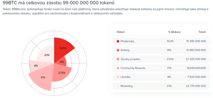 Tokenomika projektu 99Bitcoins. Zdroj: 99bitcoins.com