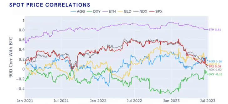 Korelace bitcoinu s ETH, dluhopisy, zlatem, dolarem, S&P 500 a NASDAQ, Zdroj: CoinDesk