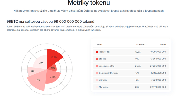 Tokenomika projektu 99Bitcoins. Zdroj: www.99bitcoins.com